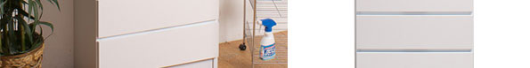 | 水を使うランドリーまわりに置くことを想定して作ってあるので、少々の水がついても塗装に影響がない「ポリエステル化粧繊維板」を前板に使用しています。ポリエステル化粧繊維板は、表面の硬度が高いので傷がつきにくい、洗剤でさっと拭ける、水分がついてもしみこみにくいので家具が傷みにくいなどの特徴があります。独特のツヤがあるので清潔感があるのも、水回りに置くのに適しています。 |
